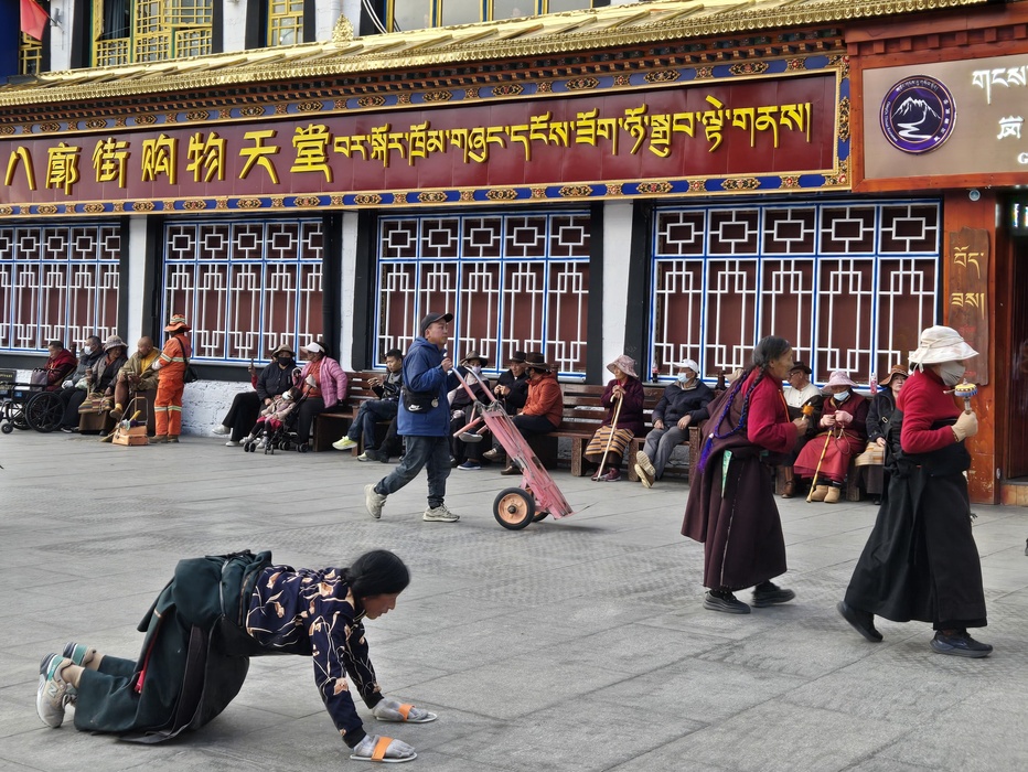 Pilgrim prostrating all the way to Lhasa, arriving at destination