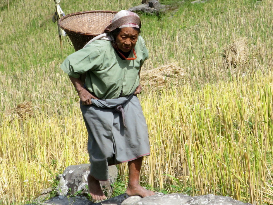 Woman carrying freshly harvested rice